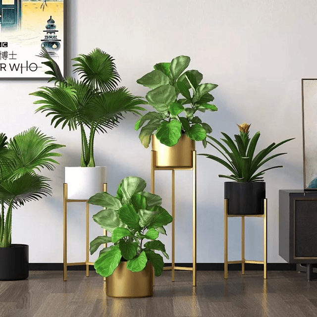 Pedestal de hierro liso color dorado con porta macetero color golden de hierro.