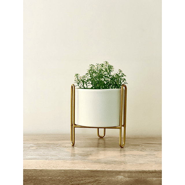 Lindo pedestal pequeño de acero color dorado con porta macetero color blanco de Metal.